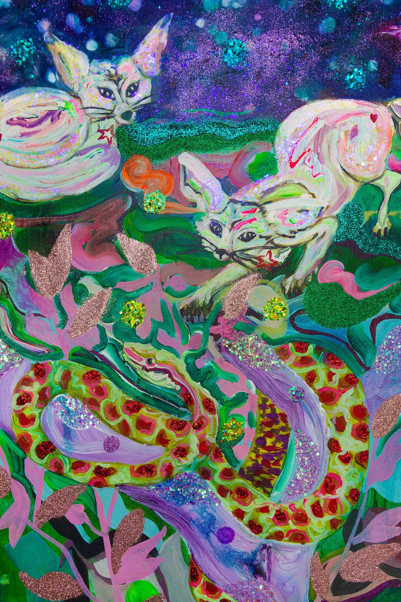 Medium: acrylic, gold leaves, fine glitter, inks