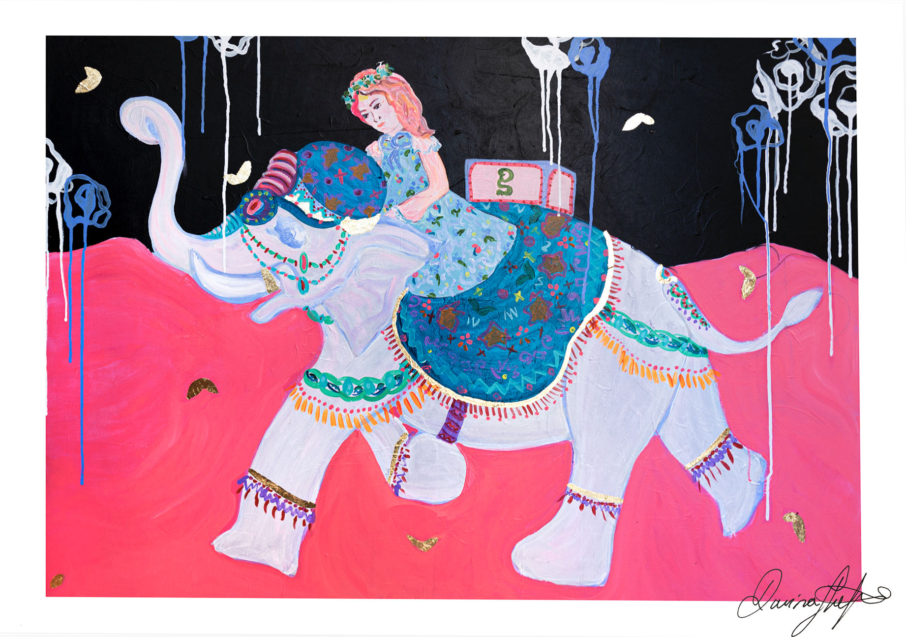 In this piece, the artist recalls her very first memory of the circus — the magical day she was chosen as a child to ride an elephant. Draped in colorful ornaments, the elephant moves with a gentle grandeur, carrying the small figure of the girl across a stage of pink and black. The scene is painted not as a literal depiction but as a nostalgic vision, imbued with softness and childlike awe. It becomes less about the circus itself and more about the pure wonder of being lifted into a world larger than oneself, where joy and tenderness linger like fragments of a dream.