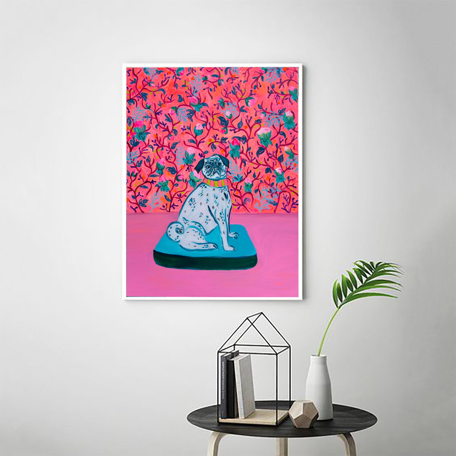 Portrait of a Pug part of the Series "Royalty Pups" which is an ensemble of six dog portraits sat on a pillow in front of a maximalist floral wallpaper.