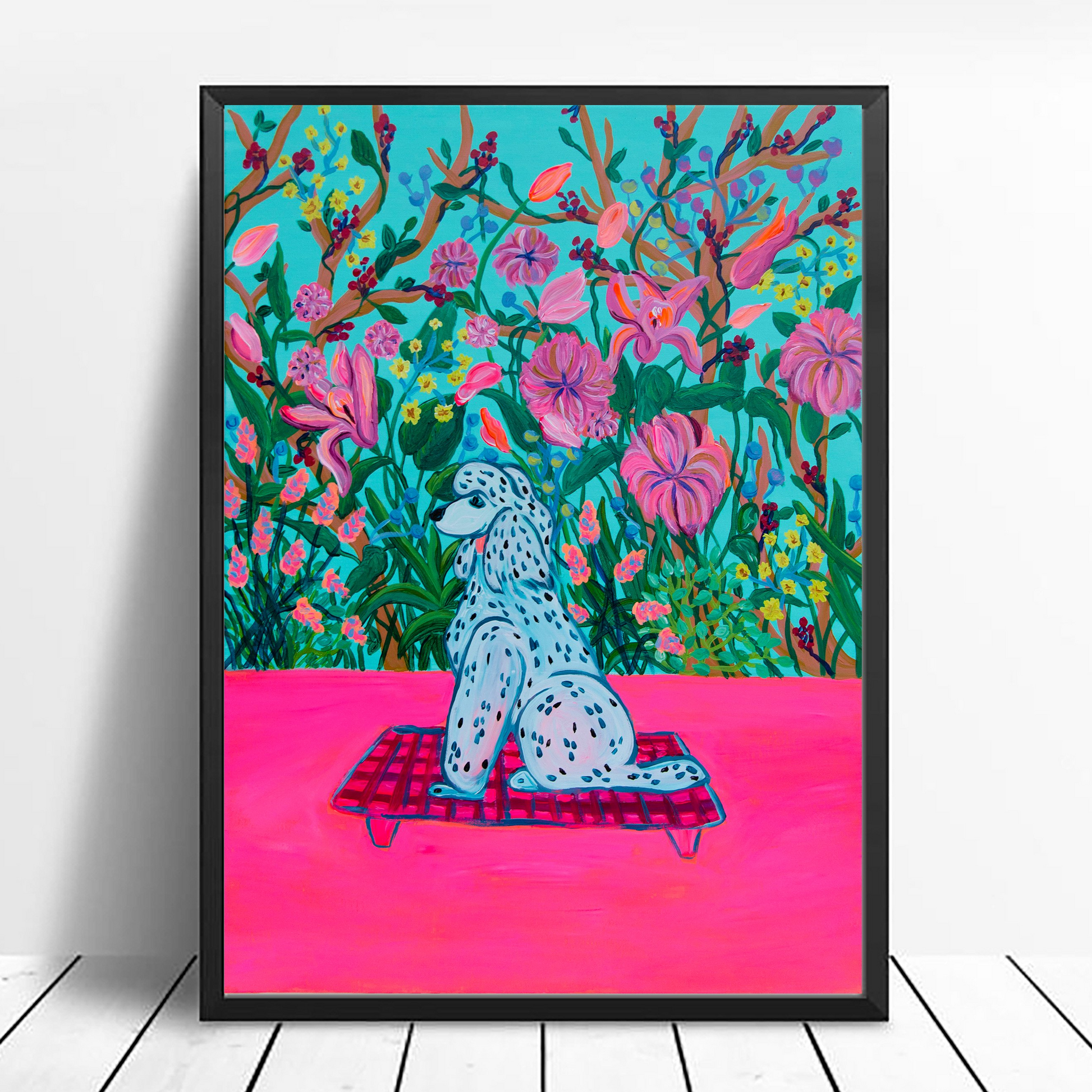 Portrait of a Poodle part of the Series "Royalty Pups" which is an ensemble of six dog portraits sat on a pillow in front of a maximalist floral wallpaper.